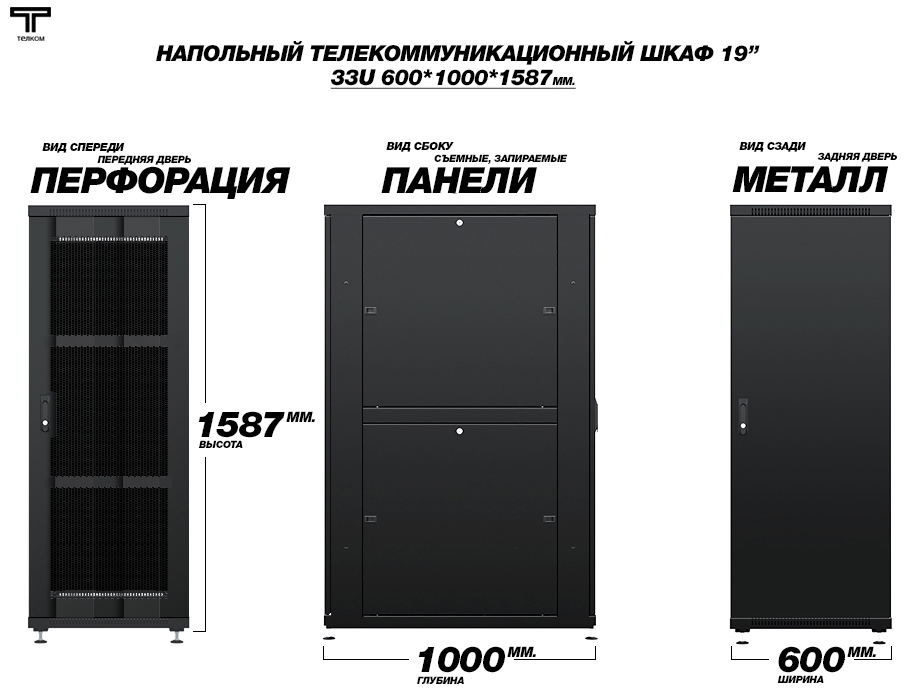 - Тип размера: 33U (ШхГхВ) 600х1000x1587мм.