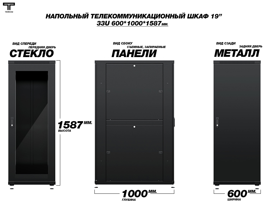 - Тип размера: 33U (ШхГхВ) 600х1000x1587мм.