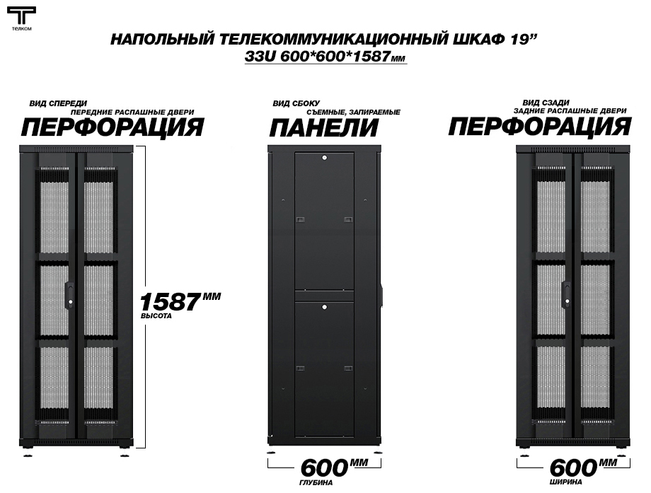 - Тип размера: 33U (ШхГхВ) 600х600x1587мм.