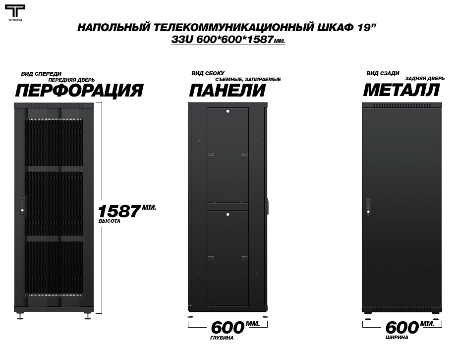 Шкаф напольный 33U телекоммуникационный 19" ТЕЛКОМ ТС-33.6.6-ПМ.9005М