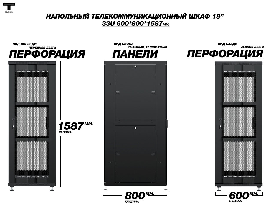 - Тип размера: 33U (ШхГхВ) 600х800x1587мм.