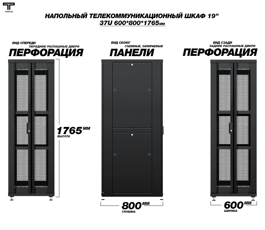 - Тип размера: 37U (ШхГхВ) 600х800x1765мм.