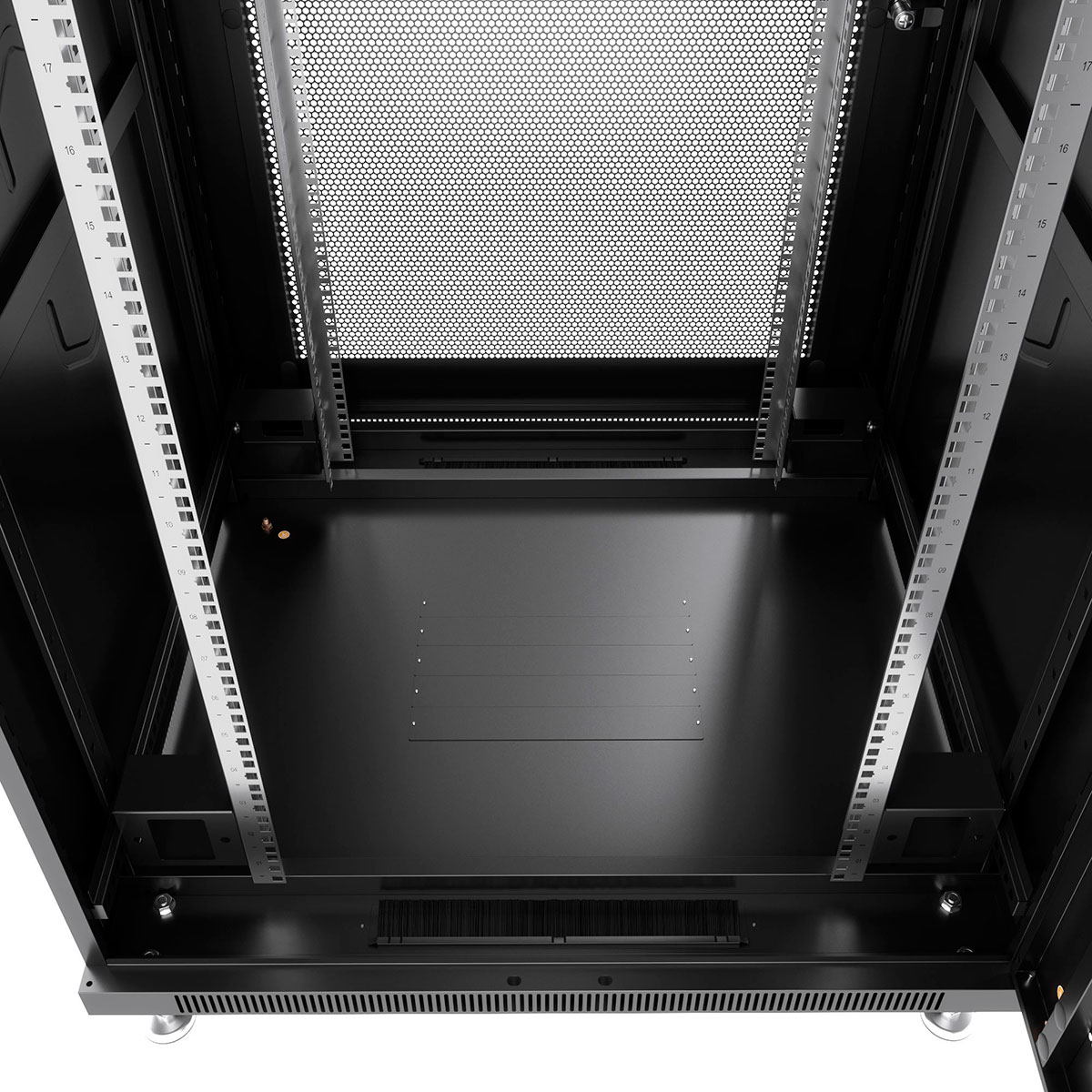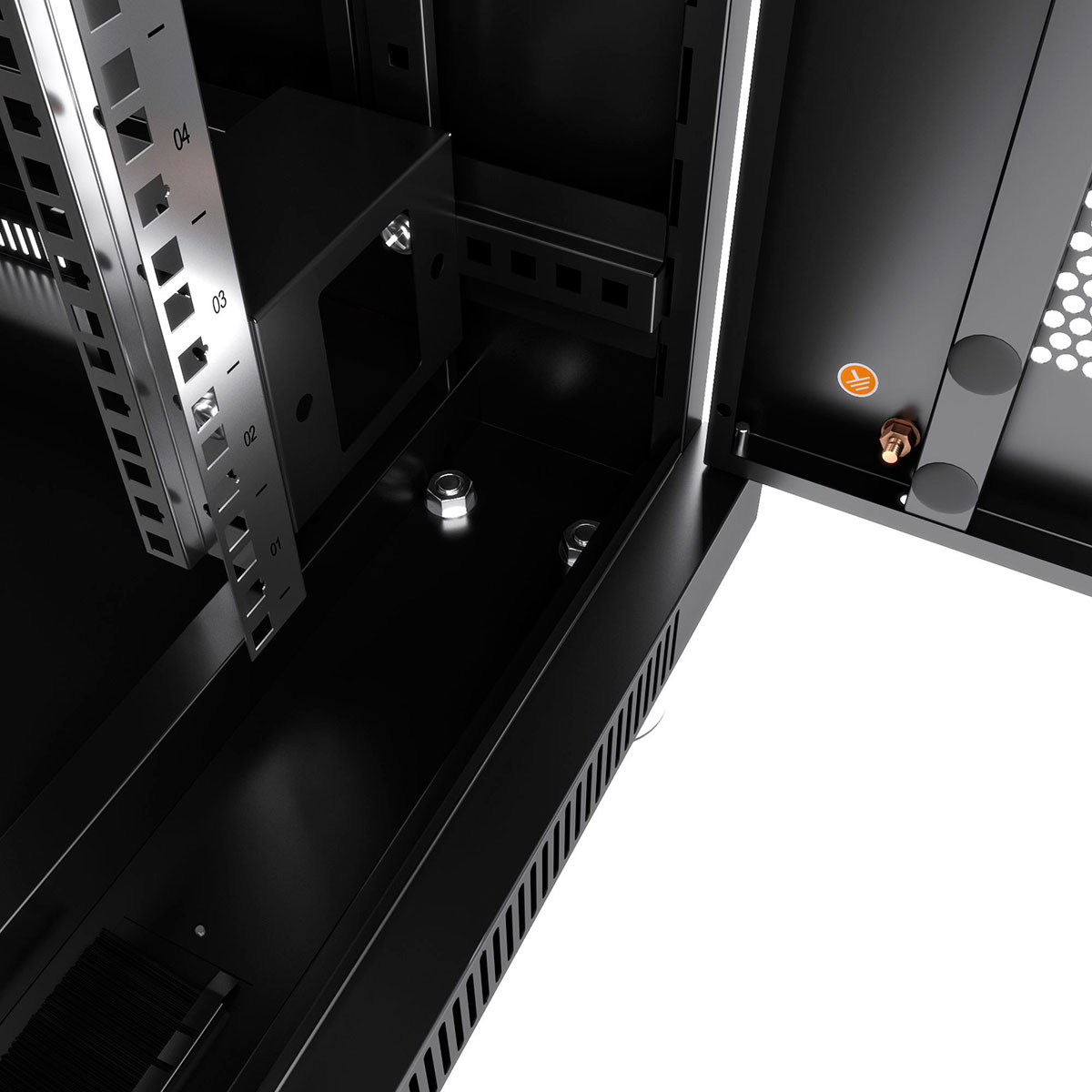 В основание шкафа и в крыше предусмотрены щеточные вводы для защиты оборудования от пыли при вводе информационного и силового кабеля.