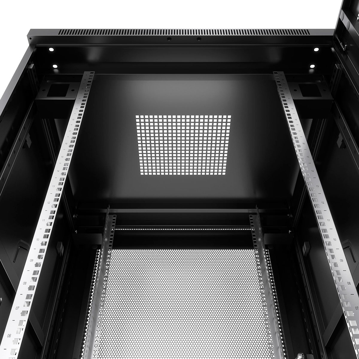 В шкафу великолепно продумана естественная (пассивная) вентиляция, за счет перфорации в корпусе шкафа и на передней дверце. В крыше предусмотрена установка активной вентиляции.