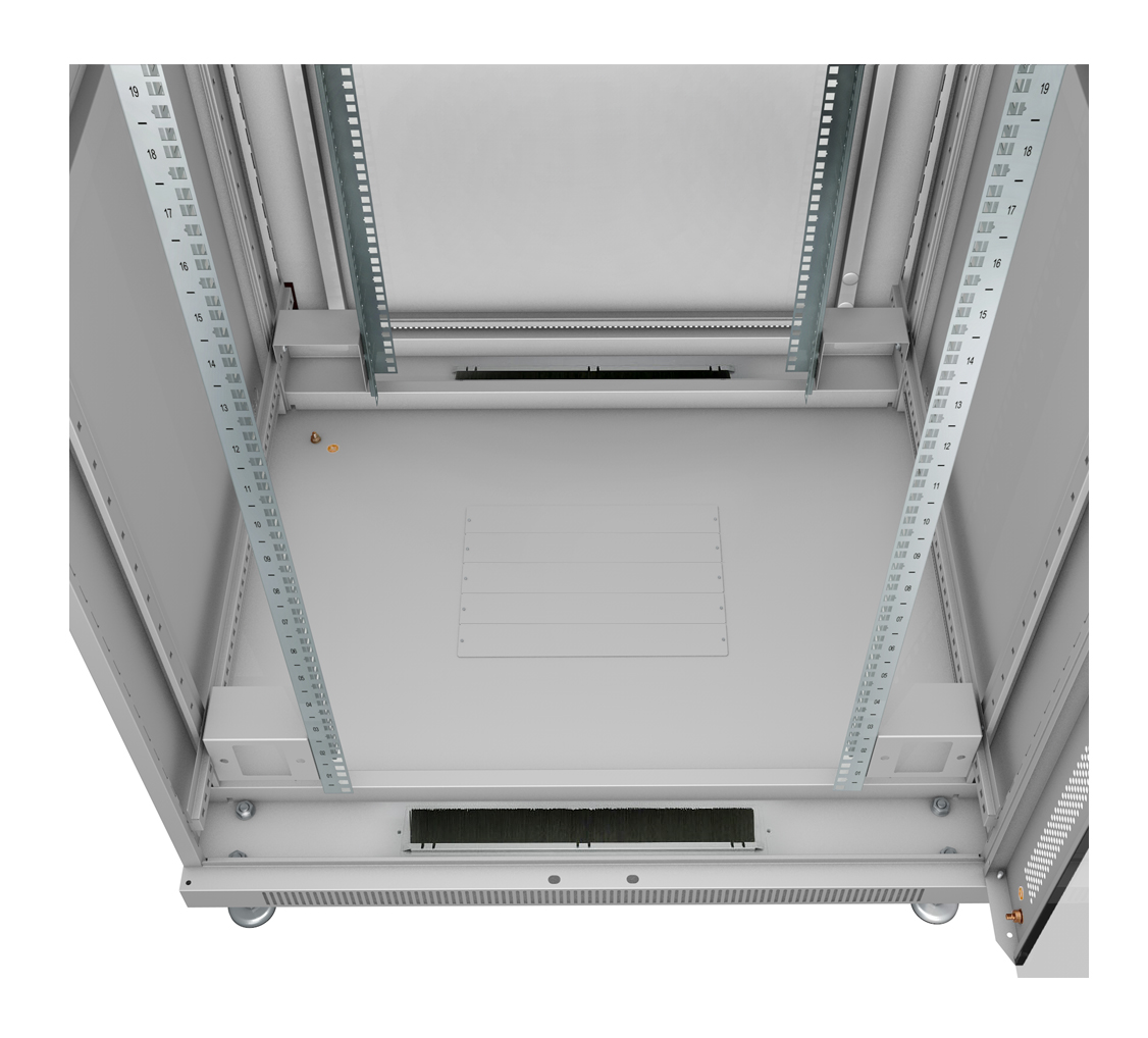 В основание шкафа и в крыше предусмотрены щеточные вводы для защиты оборудования от пыли при вводе информационного и силового кабеля.
