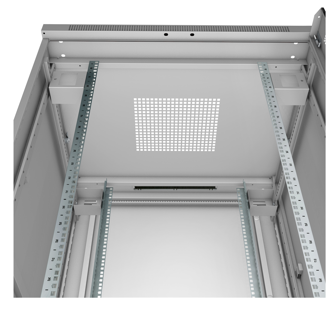 Четыре 19" монтажных L - профиля, имеют юнитовую (U) разметку в соответствии со стандартом DIN 41494-7, глубина установки направляющих может изменяться в зависимости от устанавливаемого оборудования.