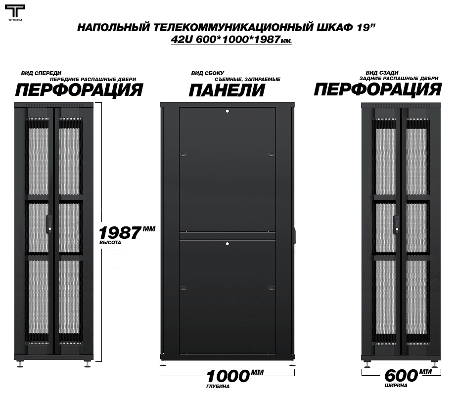 Шкаф напольный 42U телекоммуникационный 19" ТЕЛКОМ ТС-42.6.10-2П2П.9005М