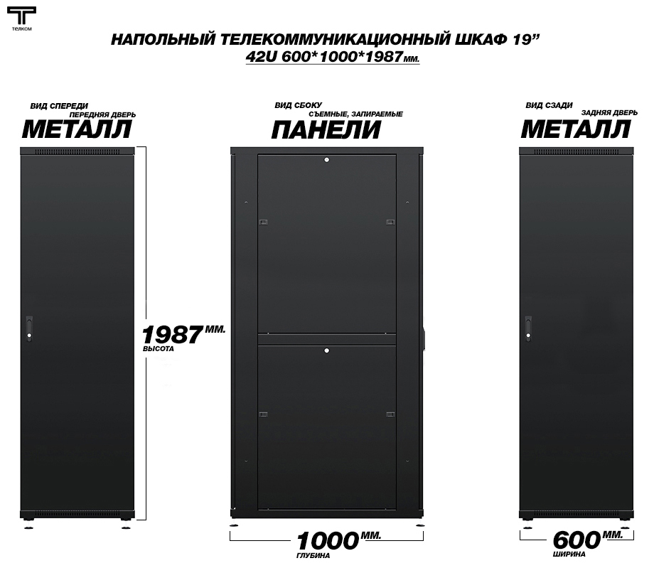 Шкаф напольный 42U телекоммуникационный 19" ТЕЛКОМ ТС-42.6.10-ММ.9005М