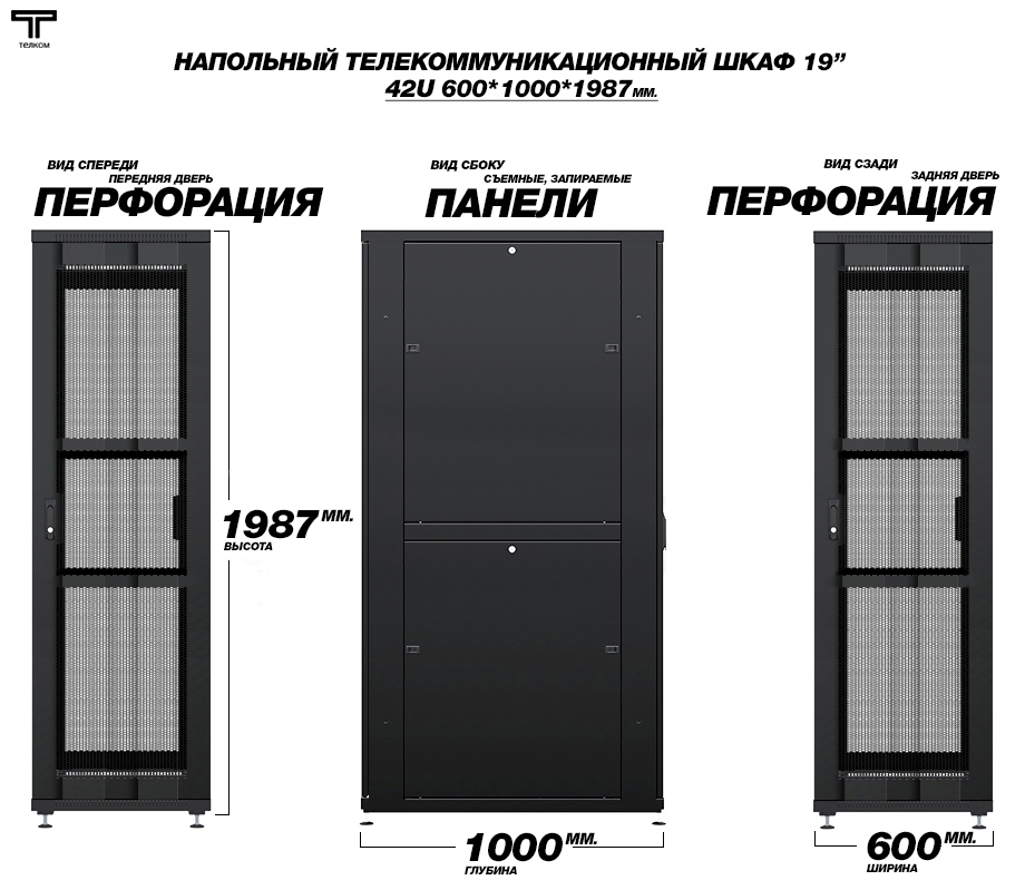 - Тип размера: 42U (ШхГхВ) 600х1000x1987мм.