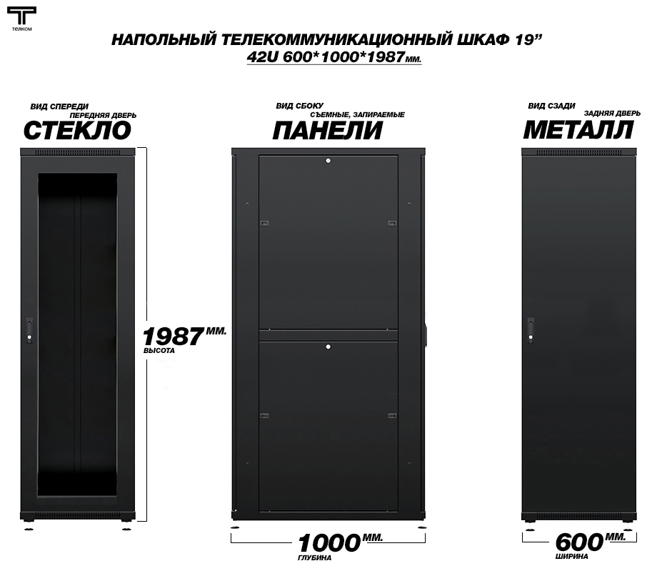 Шкаф напольный 42U телекоммуникационный 19" ТЕЛКОМ ТС-42.6.10-СМ.9005М