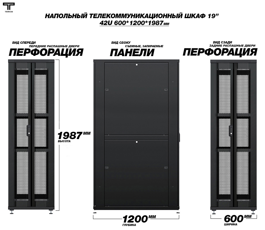 Шкаф напольный 42U телекоммуникационный 19" ТЕЛКОМ ТС-42.6.12-2П2П.9005М
