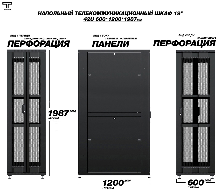 Шкаф напольный 42U телекоммуникационный 19" ТЕЛКОМ ТС-42.6.12-2ПП.9005М