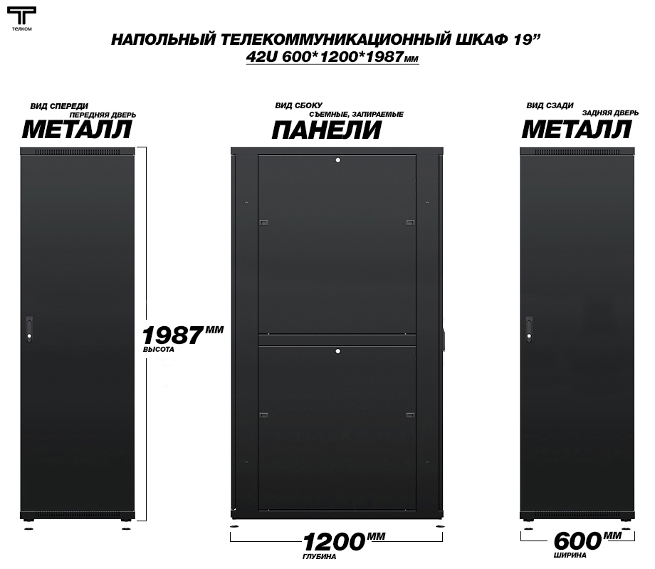 Шкаф напольный 42U телекоммуникационный 19" ТЕЛКОМ ТС-42.6.12-ММ.9005М