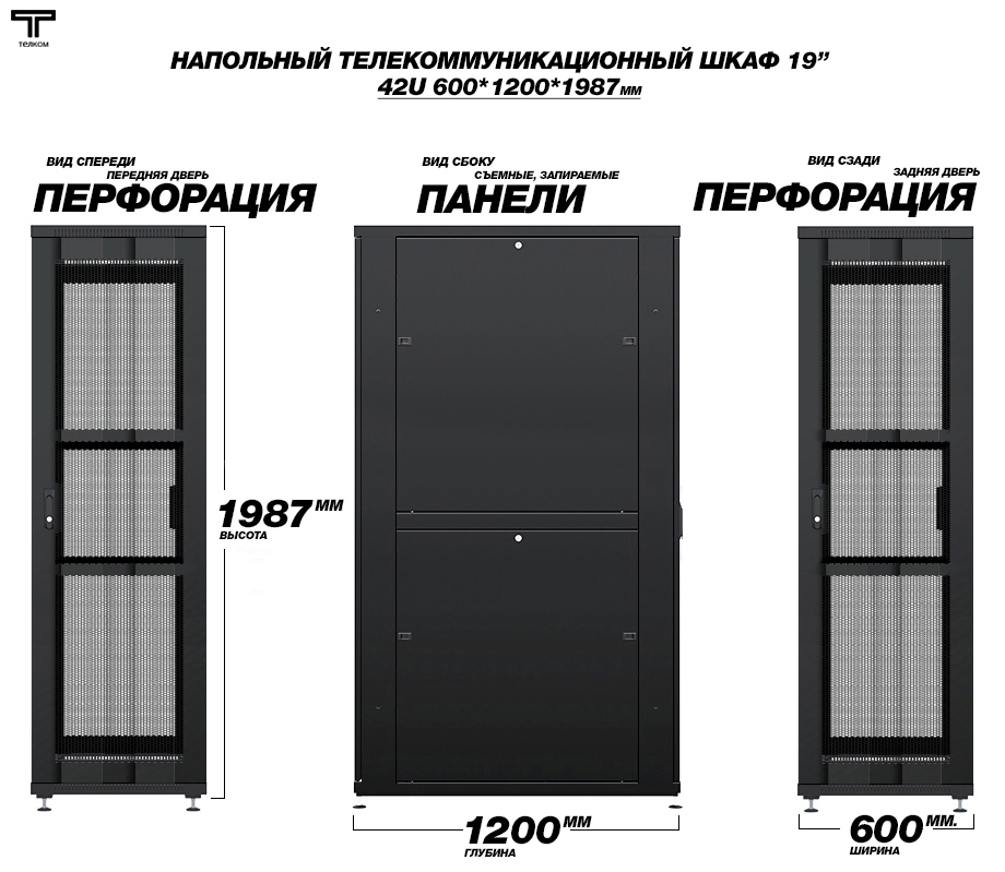 Шкаф напольный 42U телекоммуникационный 19" ТЕЛКОМ ТС-42.6.12-ПП.9005М