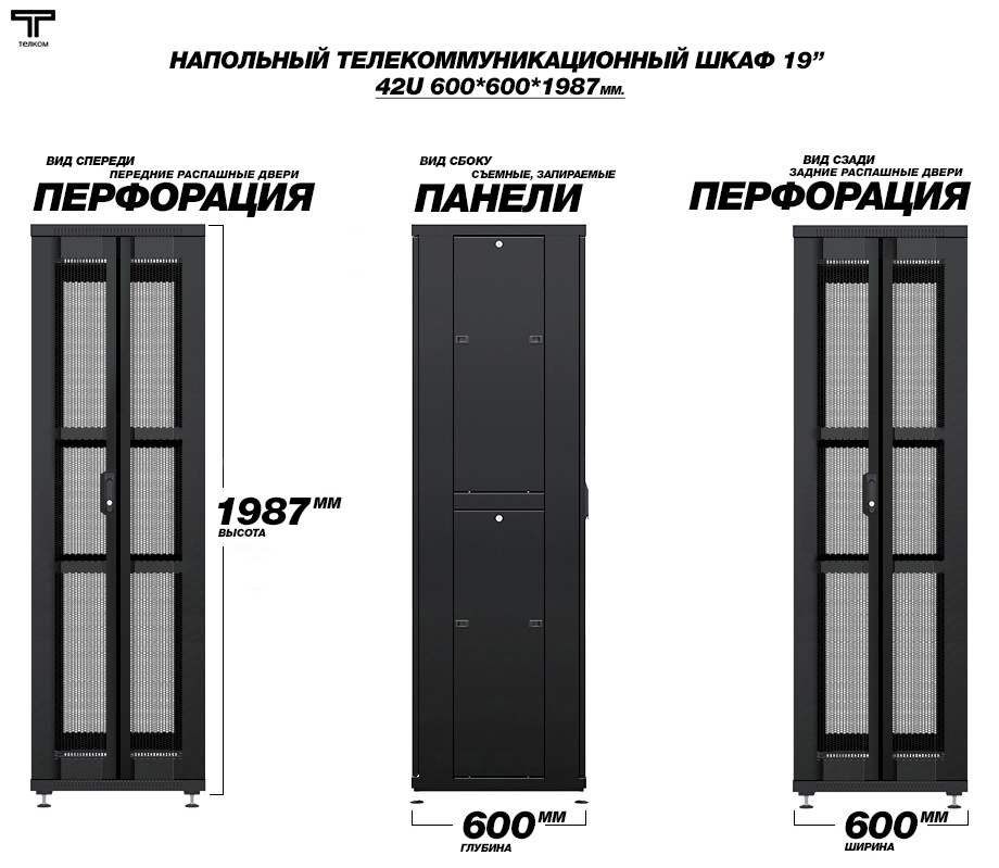 - Тип размера: 42U (ШхГхВ) 600х600x1987мм.