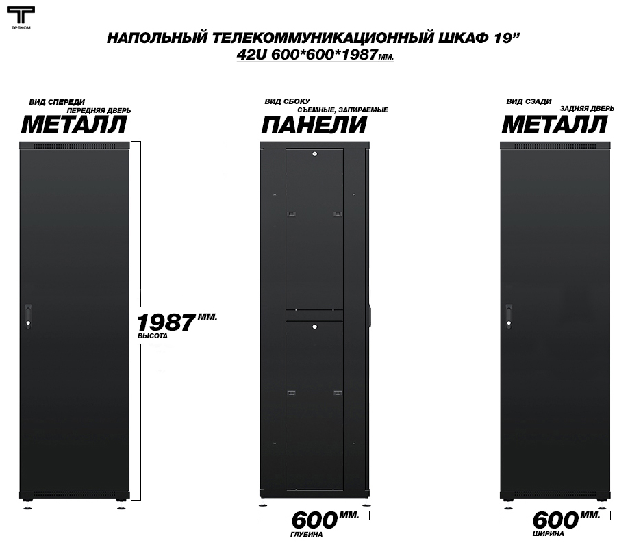 - Тип размера: 42U (ШхГхВ) 600х600x1987мм.
