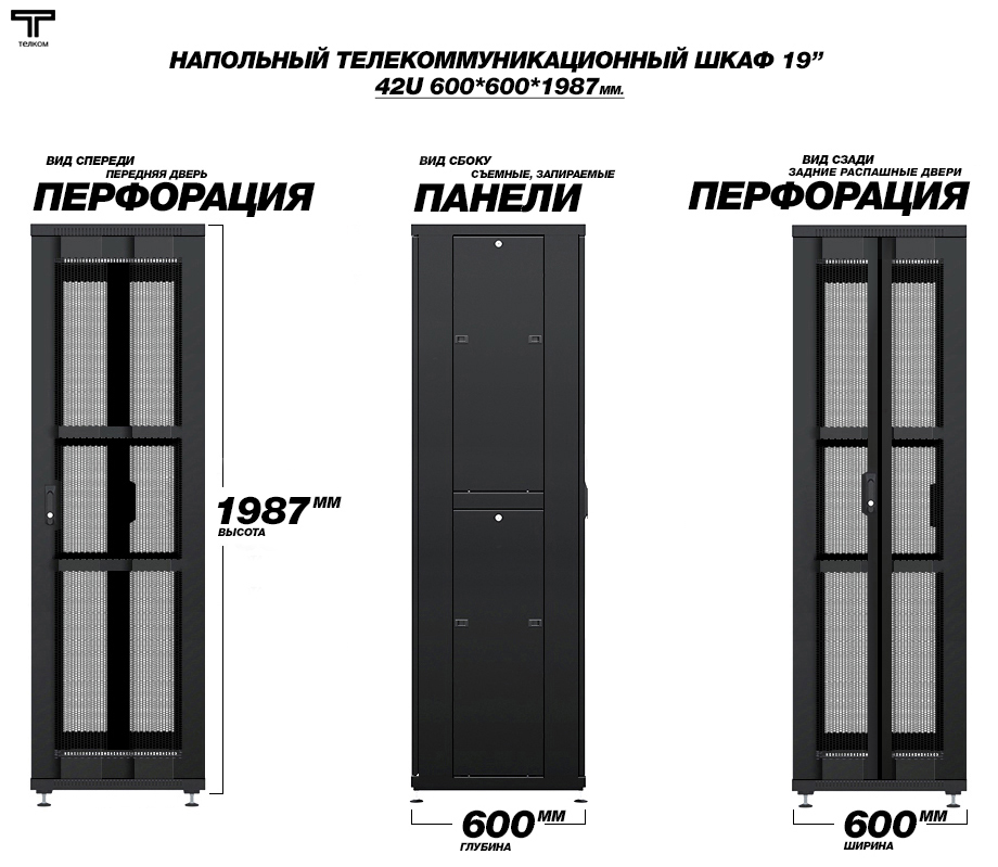 Шкаф напольный 42U телекоммуникационный 19" ТЕЛКОМ ТС-42.6.6-П2П.9005М
