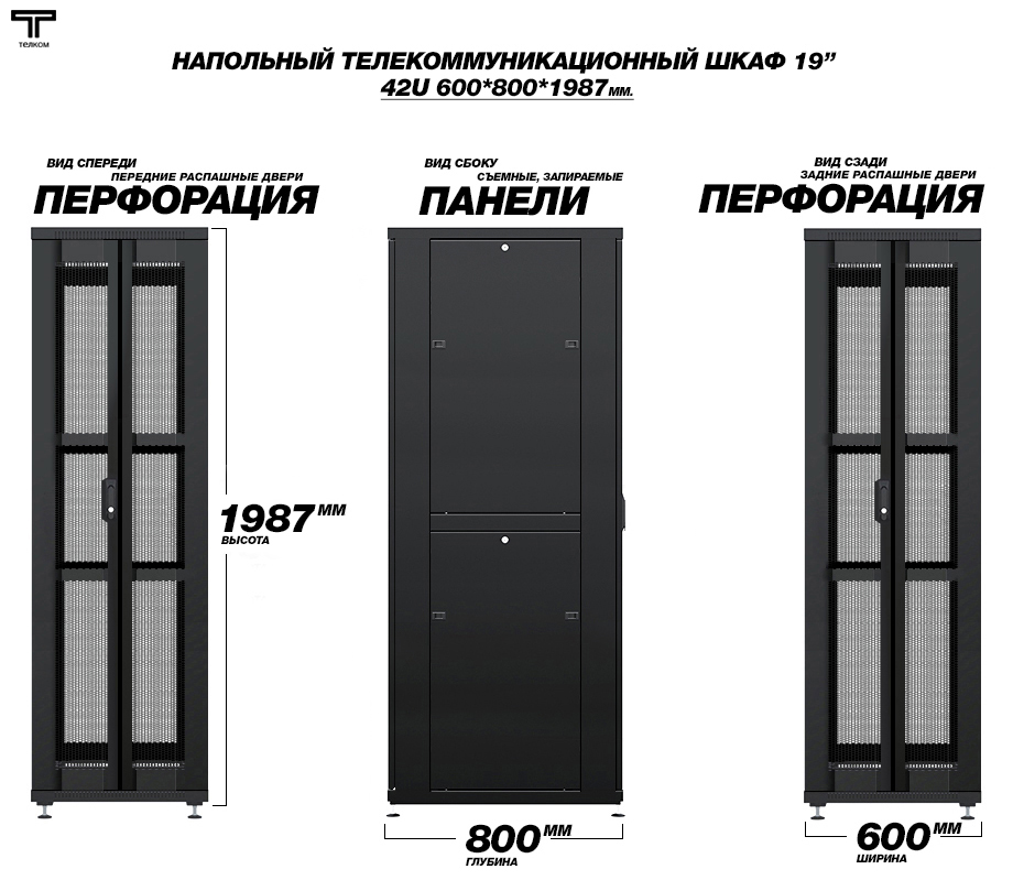 - Тип размера: 42U (ШхГхВ) 600х800x1987мм.