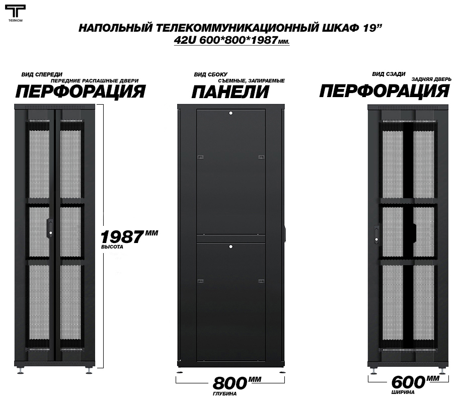 Шкаф напольный 42U телекоммуникационный 19" ТЕЛКОМ ТС-42.6.8-2ПП.9005М