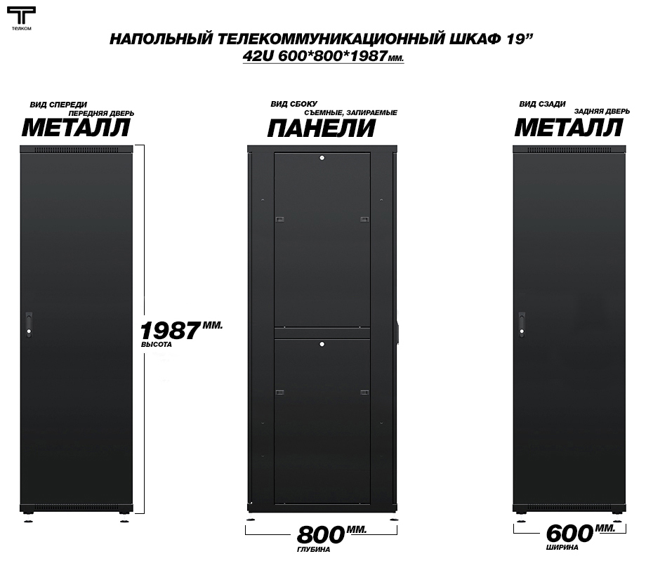 Шкаф напольный 42U телекоммуникационный 19" ТЕЛКОМ ТС-42.6.8-ММ.9005М