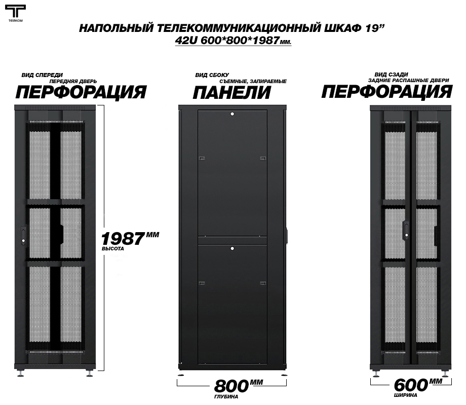 Шкаф напольный 42U телекоммуникационный 19" ТЕЛКОМ ТС-42.6.8-П2П.9005М