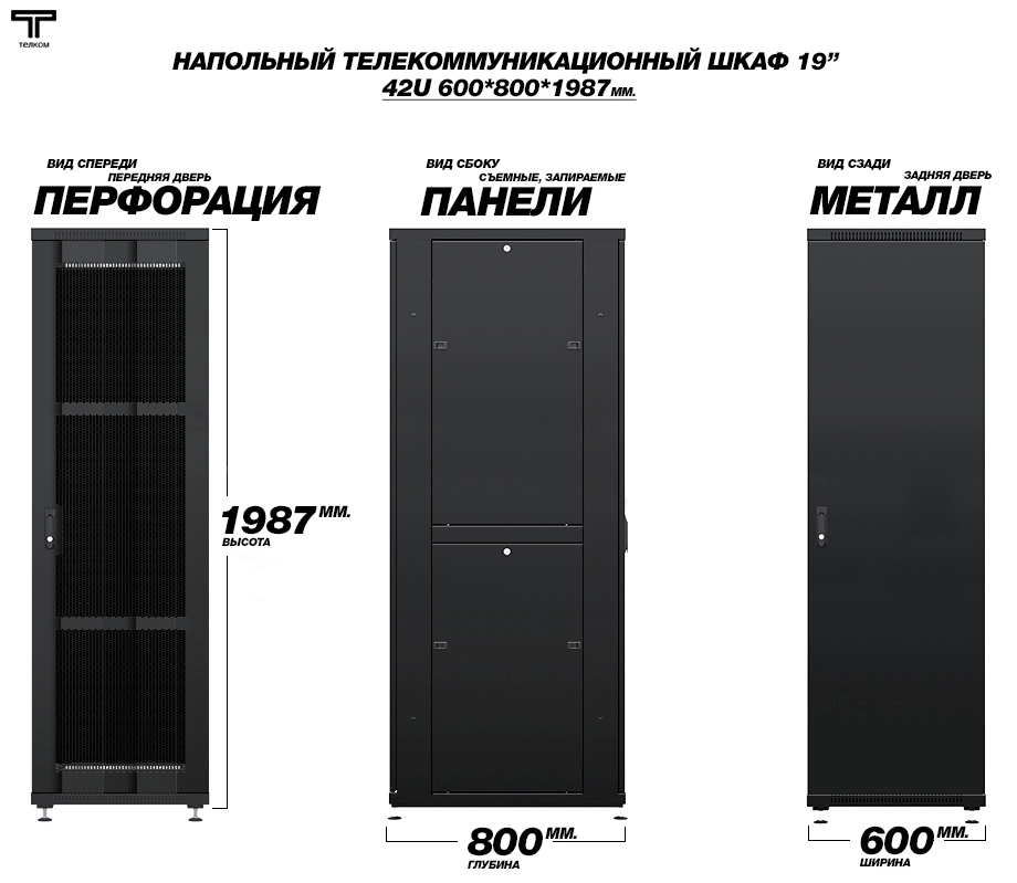 Шкаф напольный 42U телекоммуникационный 19" ТЕЛКОМ ТС-42.6.8-ПМ.9005М