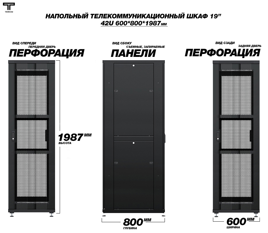 - Тип размера: 42U (ШхГхВ) 600х800x1987мм.