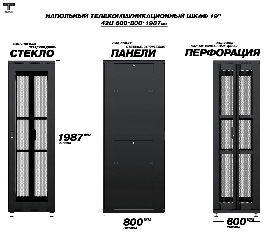 Шкаф напольный 42U телекоммуникационный 19" ТЕЛКОМ ТС-42.6.8-С2П.9005М