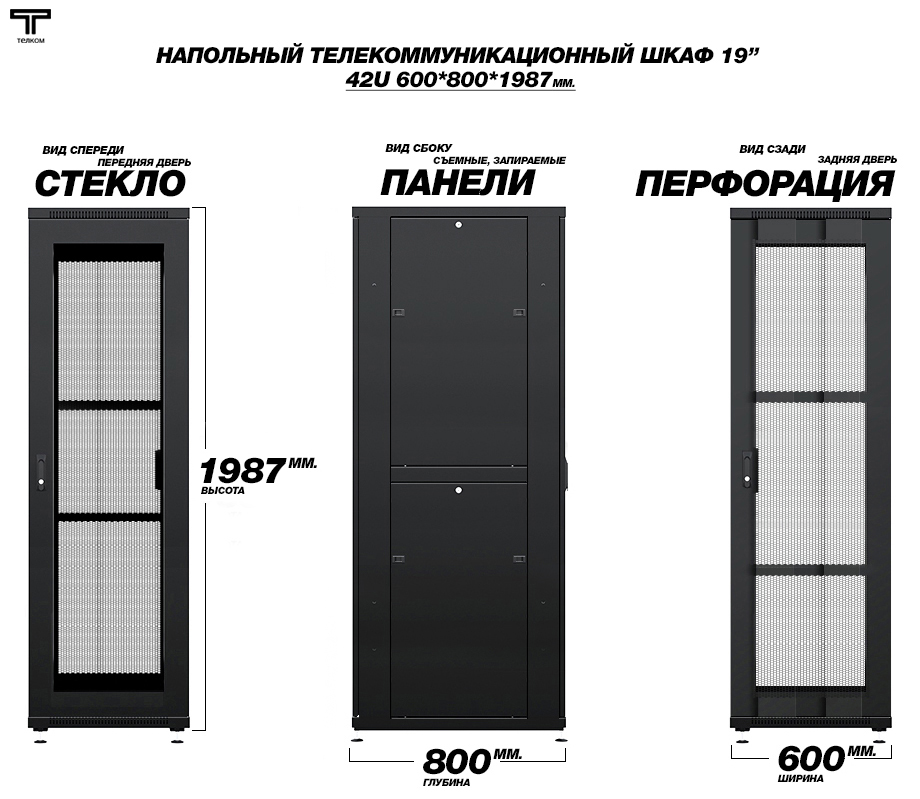Шкаф напольный 42U телекоммуникационный 19" ТЕЛКОМ ТС-42.6.8-СП.9005М