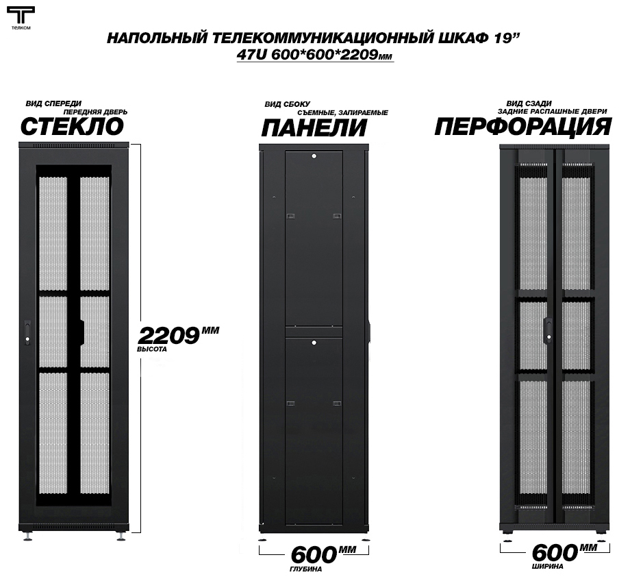 Шкаф напольный 42U телекоммуникационный 19" ТЕЛКОМ ТС-47.6.6-С2П.9005М