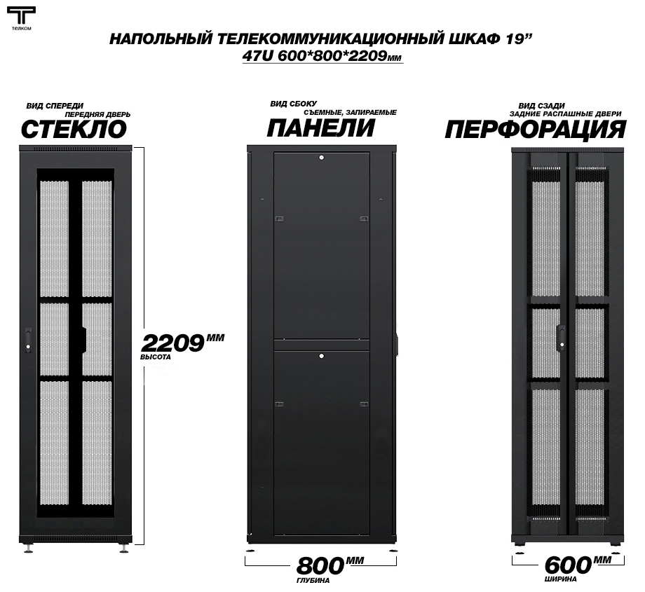 Шкаф напольный 42U телекоммуникационный 19" ТЕЛКОМ ТС-47.6.8-С2П.9005М