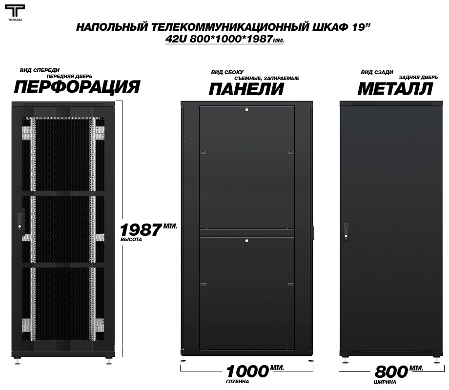 Шкаф напольный 42U телекоммуникационный 19" ТЕЛКОМ ТСМ-42.8.10-ПМ.9005М