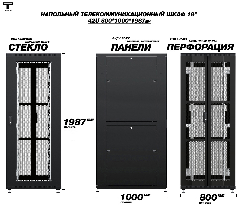 Шкаф напольный 42U телекоммуникационный 19" ТЕЛКОМ ТСМ-42.8.10-С2П.9005М