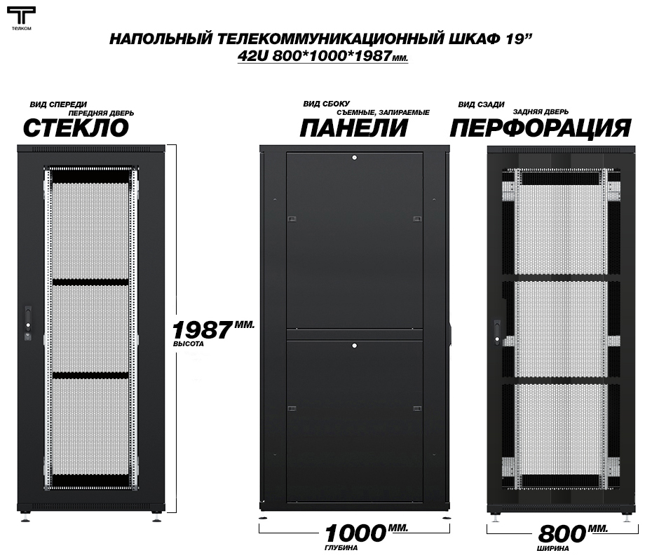 - Тип размера: 42U (ШхГхВ) 800х1000x1987мм.
