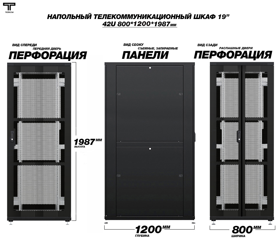 Шкаф напольный 42U телекоммуникационный 19" ТЕЛКОМ ТСМ-42.8.12-П2П.9005М