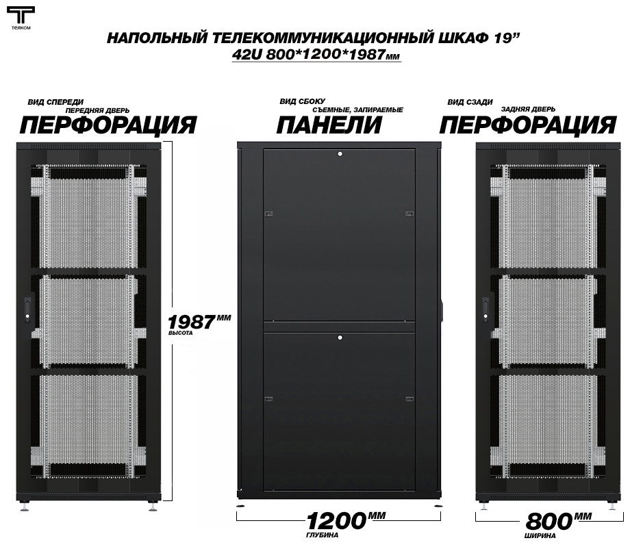 - Тип размера: 42U (ШхГхВ) 800х1200x1987мм.