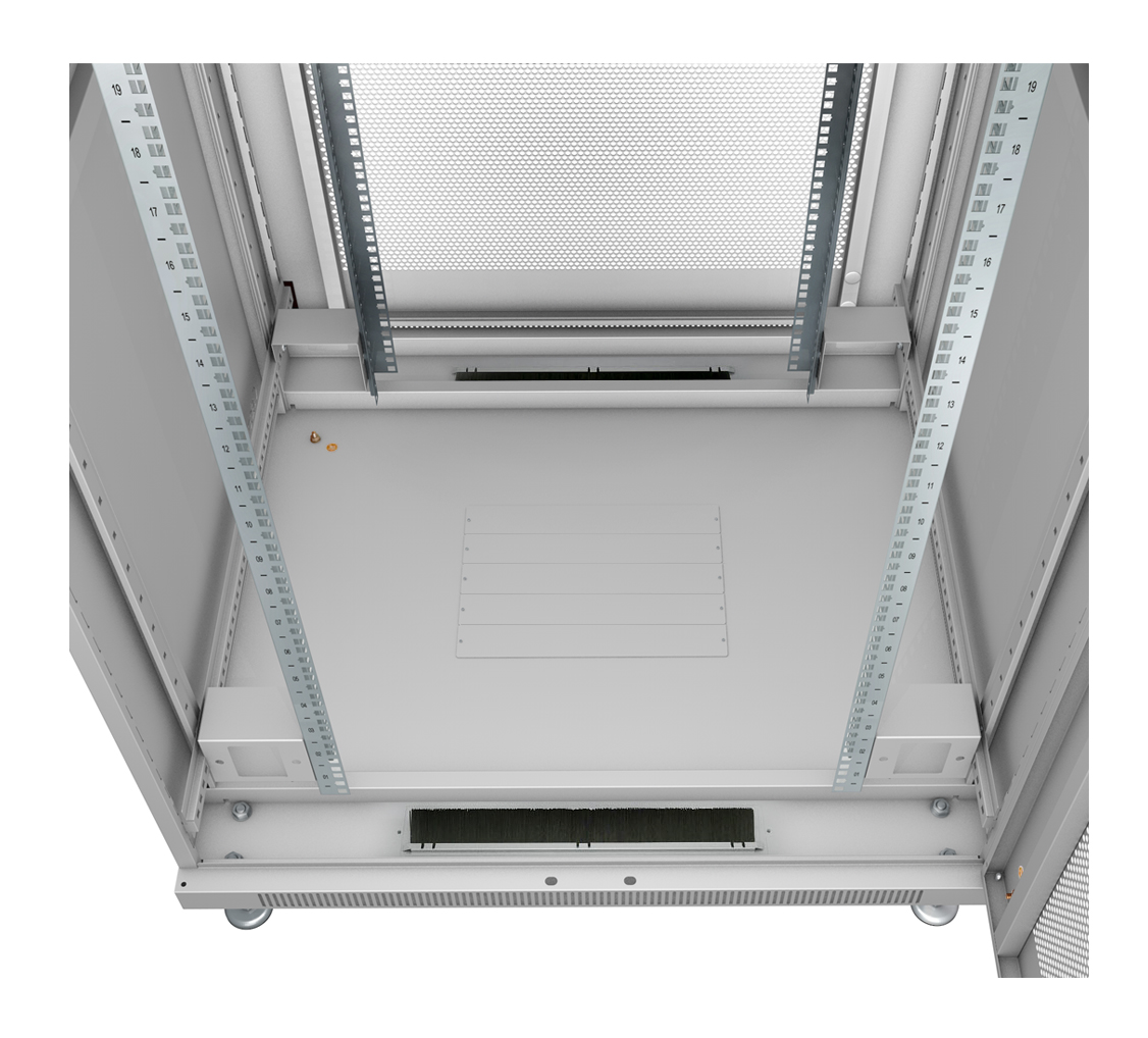 В основание шкафа и в крыше предусмотрены щеточные вводы для защиты оборудования от пыли при вводе информационного и силового кабеля.