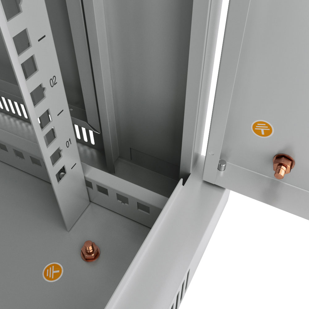 В стандартной конфигурации шкаф оборудован: задней стенкой, передними и задними монтажными профилями и двумя кабельным вводами сверху и снизу. Легкий доступ к установленному оборудованию организован за счет съемных боковых панелей. В шкафу великолепно продумана естественная (пассивная) вентиляция, за счет перфорации в корпусе шкафа и на передней дверце. А так же, конструктивно, предусмотрена установка активной вентиляции.