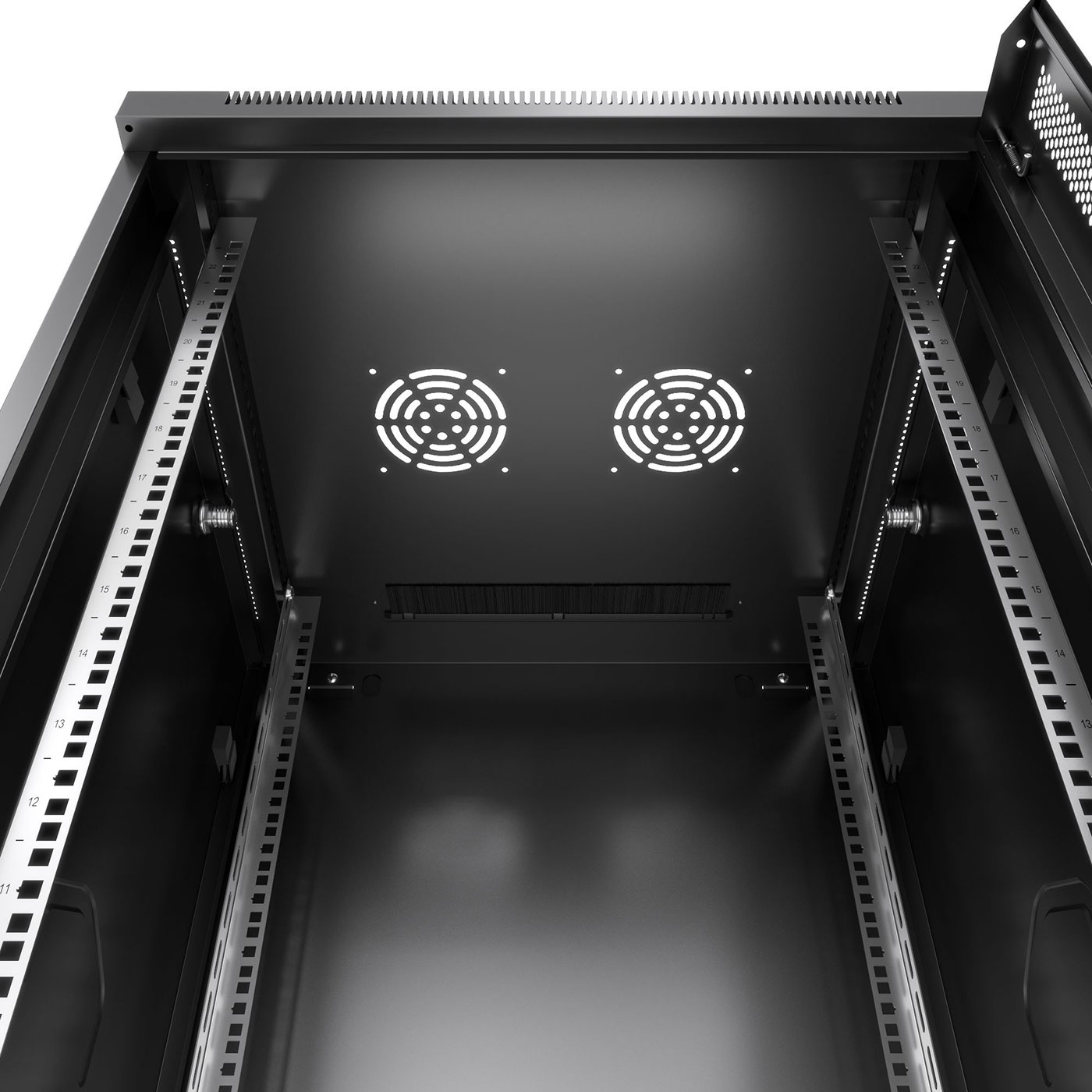 В стандартной конфигурации шкаф оборудован: задней стенкой, передними и задними монтажными профилями и двумя кабельным вводами сверху и снизу. Легкий доступ к установленному оборудованию организован за счет съемных боковых панелей. В шкафу великолепно продумана естественная (пассивная) вентиляция, за счет перфорации в корпусе шкафа и на передней дверце. А так же, конструктивно, предусмотрена установка активной вентиляции.
