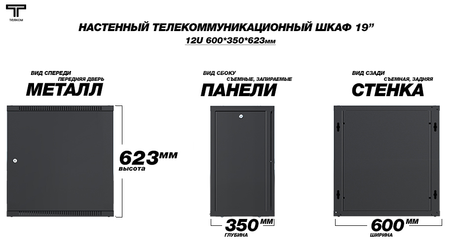 Шкаф настенный 12U телекоммуникационный 19" ТЕЛКОМ TL-12.6.3-M.9005МА