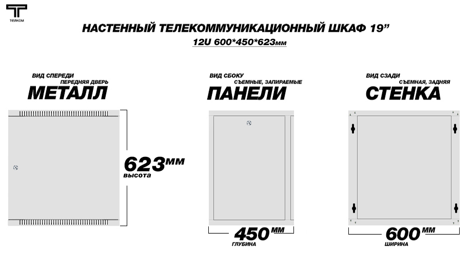 Шкаф настенный 12U телекоммуникационный 19" ТЕЛКОМ TL-12.6.4-M.7035Ш