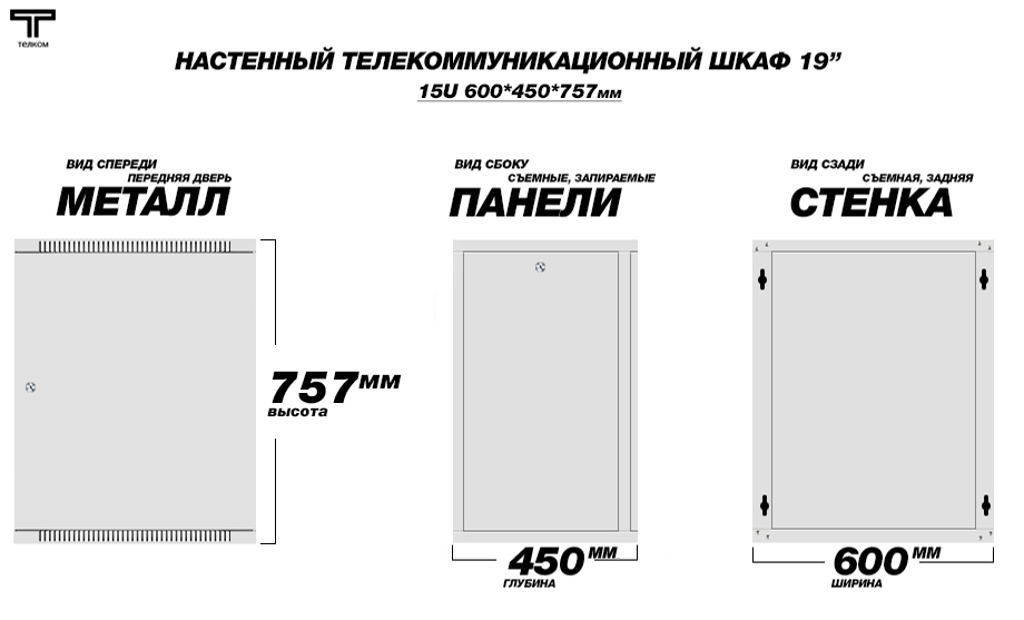 Шкаф настенный 15U телекоммуникационный 19" ТЕЛКОМ TL-15.6.4-M.7035Ш