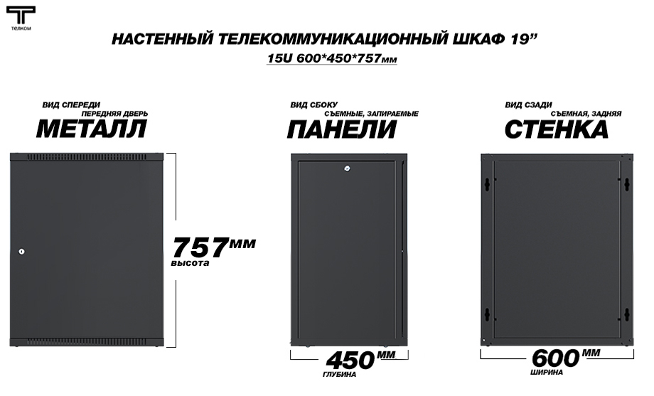 Шкаф настенный 15U телекоммуникационный 19" ТЕЛКОМ TL-15.6.4-M.9005МА