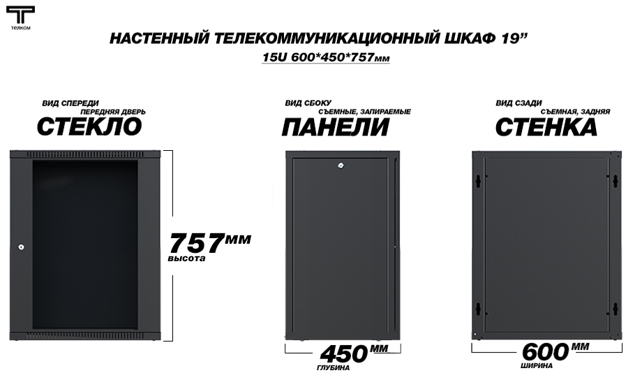 Шкаф настенный 15U телекоммуникационный 19" ТЕЛКОМ TL-15.6.4-С.9005МА