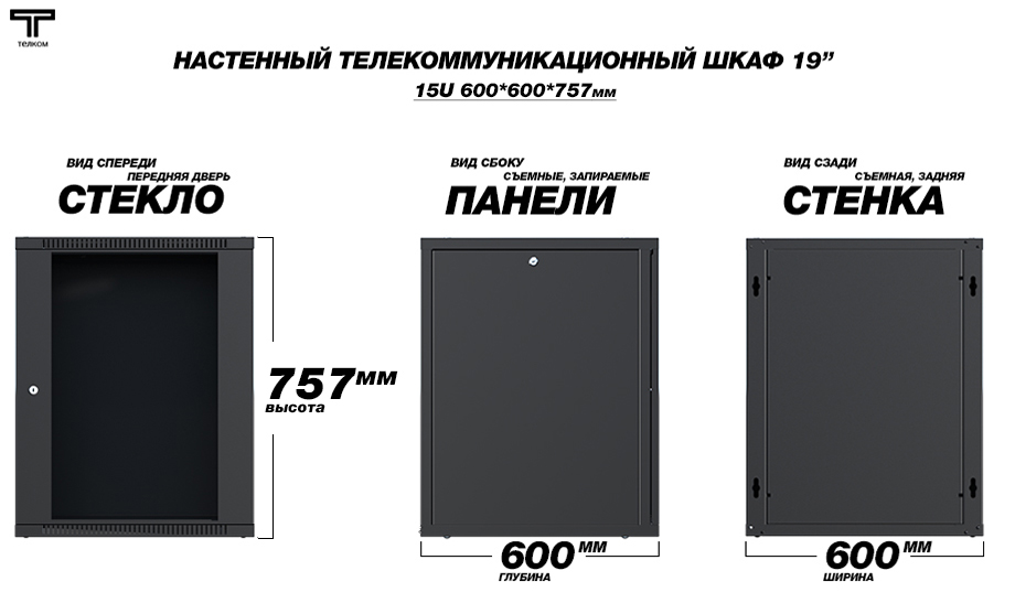 Шкаф настенный 15U телекоммуникационный 19" ТЕЛКОМ TL-15.6.6-С.9005МА