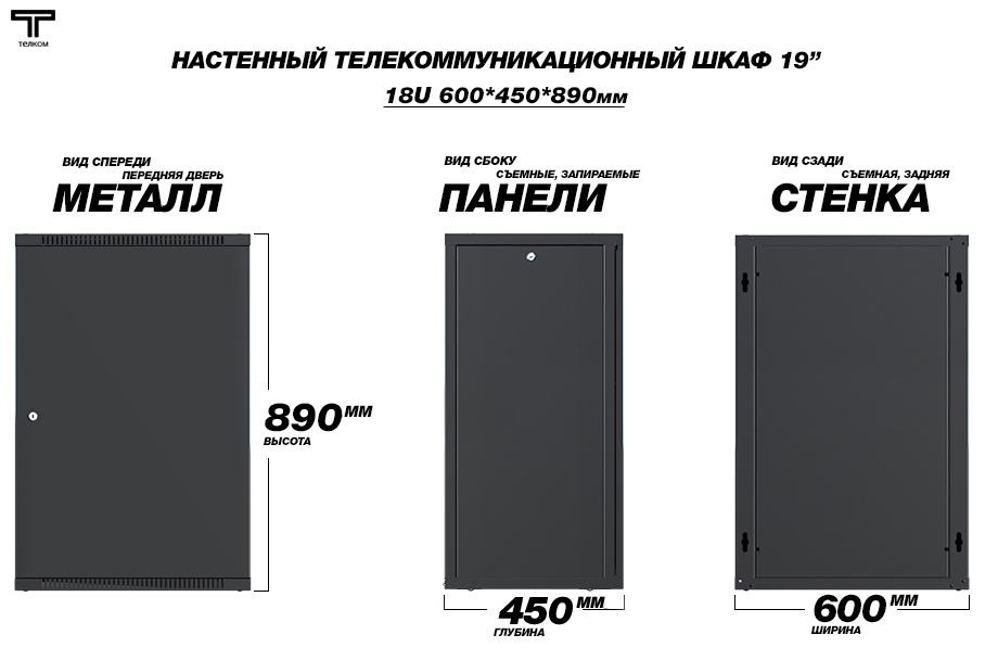 Шкаф настенный 18U телекоммуникационный 19" ТЕЛКОМ TL-18.6.4-M.9005МА