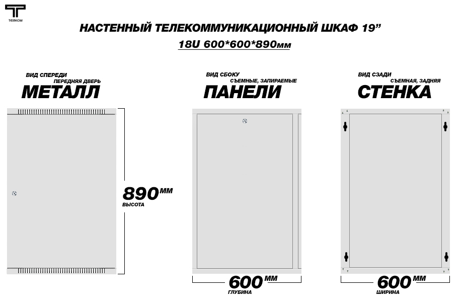 Шкаф настенный 18U телекоммуникационный 19" ТЕЛКОМ TL-18.6.6-M.7035Ш