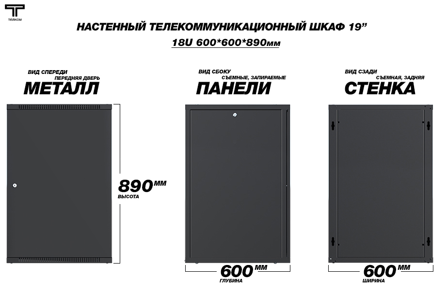 Шкаф настенный 18U телекоммуникационный 19" ТЕЛКОМ TL-18.6.6-M.9005МА