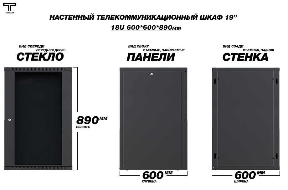 Шкаф настенный 18U телекоммуникационный 19" ТЕЛКОМ TL-18.6.6-С.9005МА