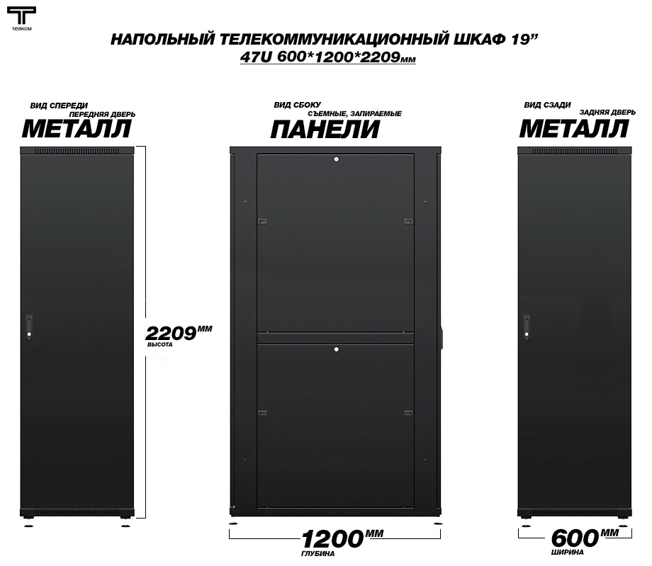 Шкаф напольный 47U телекоммуникационный 19" ТЕЛКОМ ТС-47.6.12-ММ.9005М